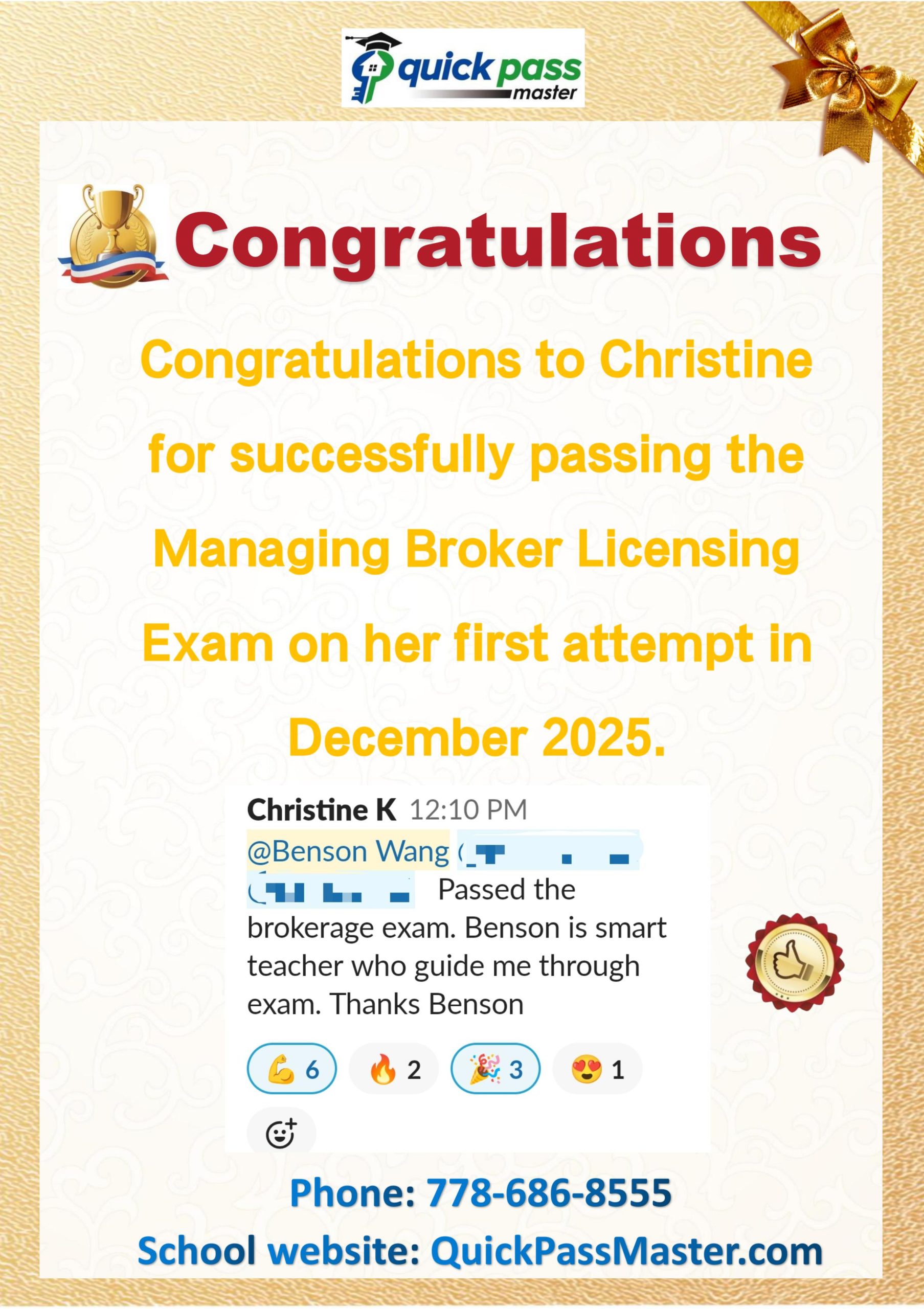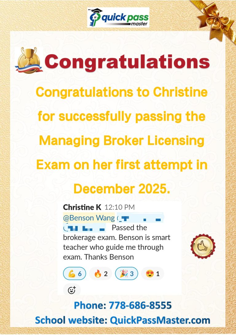 Congratulations to Christine for successfully passing the Managing Broker Licensing Exam on her first attempt in December 2025