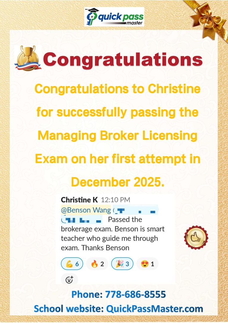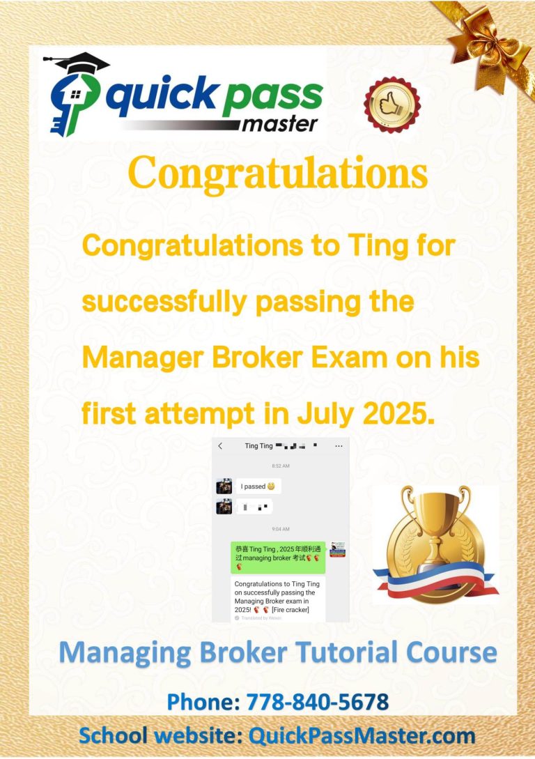 We know that passing these mandatory exams are a challenge especially for agents with a busy practice. Quick Pass Master offers a Broker’s Licensing Course to help students pass the exam to be a Managing Broker in BC, enabling them to enjoy a very rewarding career as a managing broker and meet their aspirations!
