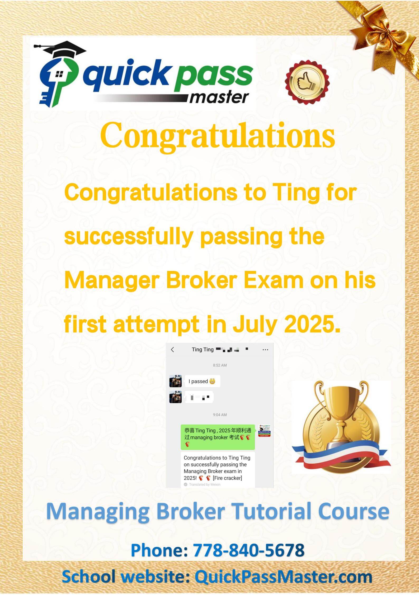 Congratulations to Ting for successfully passing the Manager Broker Exam on his first attempt in July 2025