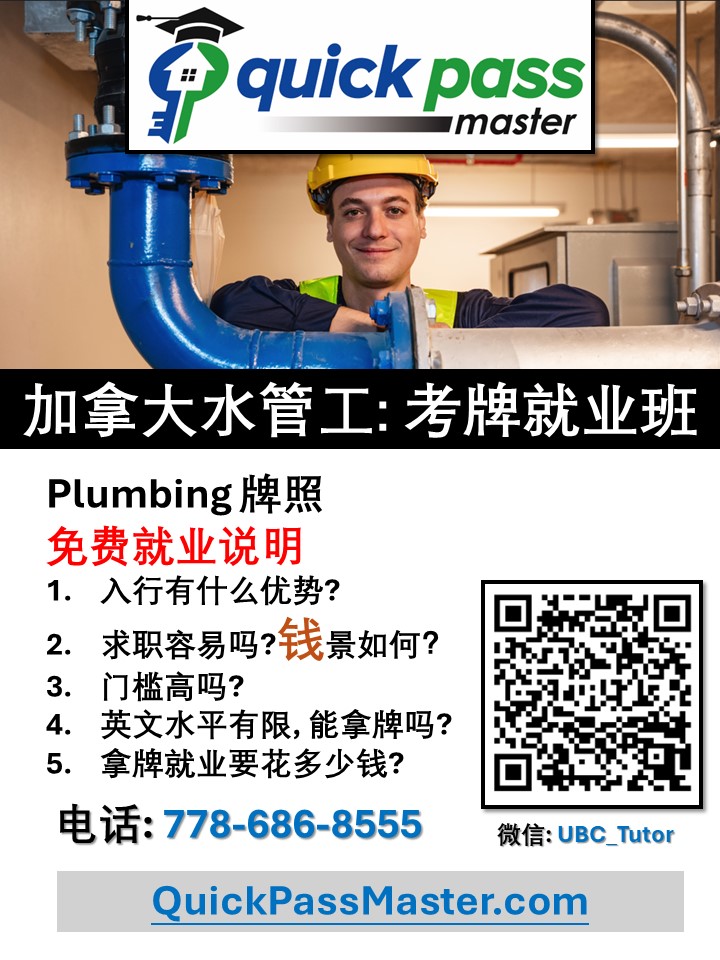 加拿大水管工(plumber)考牌就业免费讲座,只需要10分钟就让您明白此高薪低入行门槛的职业。适合新移民,英文不强不是核心问题